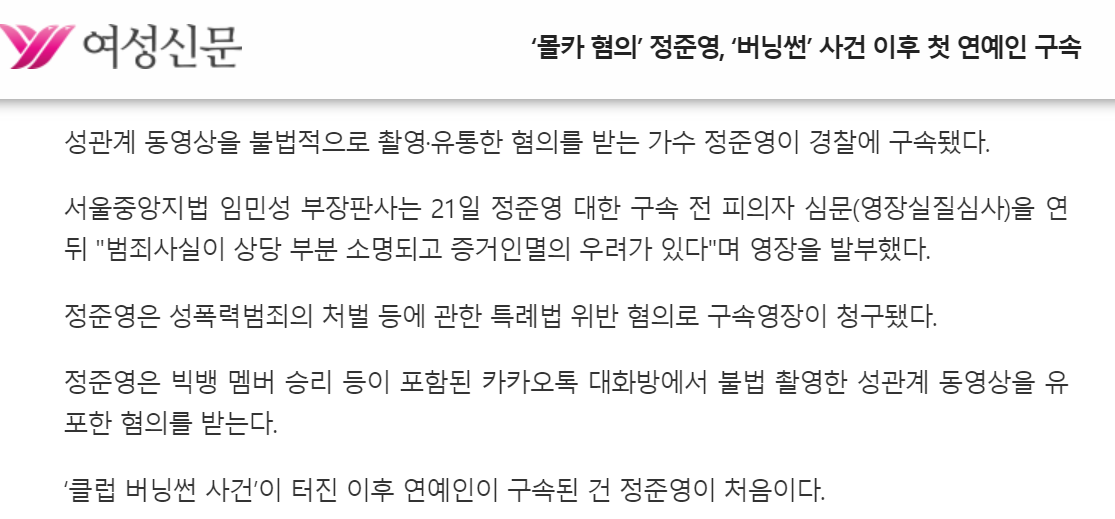 가수 정준영이 친구들끼리 카톡 대화방에 불법 촬영물을 공유한 혐의로 구속되었다.