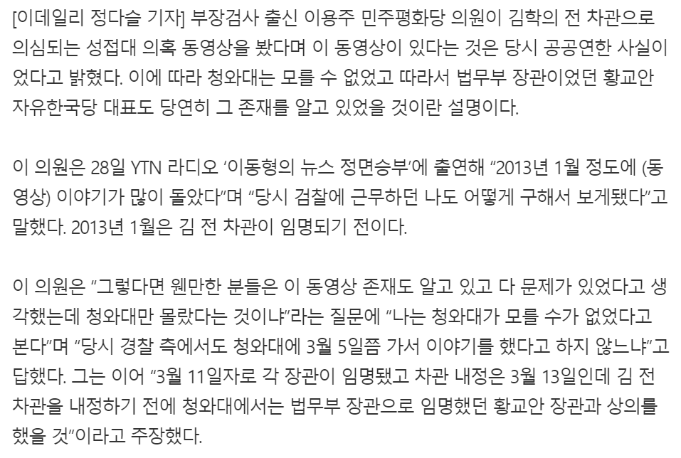 이제는 여기에 더해 전직 부장검사 출신인 이용주 의원도 황교안도 봤을 것이라는 주장과 함께 본인 역시 해당 불법 촬영 동영상을 보았다고 나섰다.