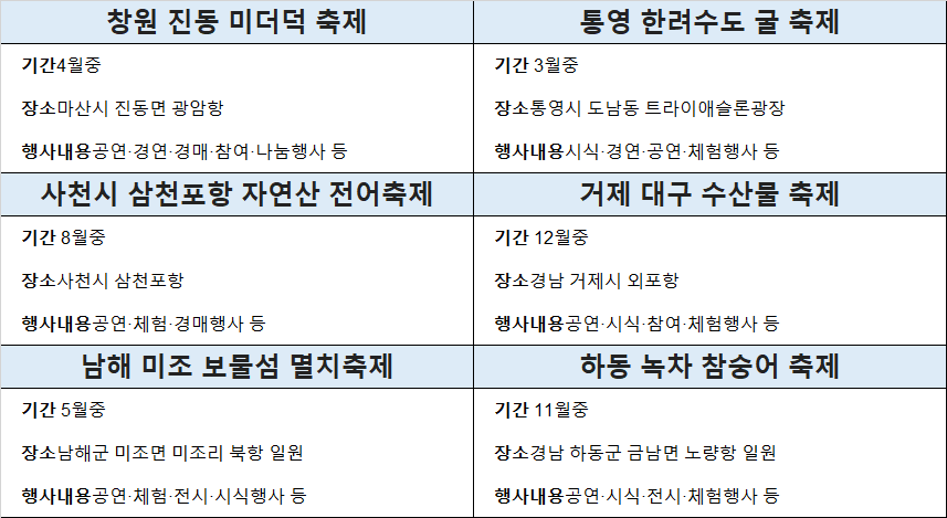 경남 해산물 축제는 창원 진동 미더덕 축제, 등이 있 통영 한려수도 굴축제, 삼천포 자연산 전어축제, 거제 대구 수산물 축제, 하동 녹차 참숭어 축제 등이 있다.