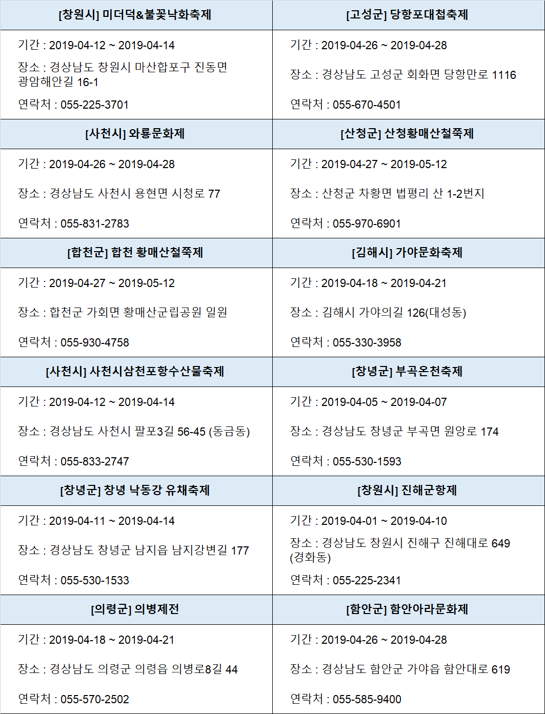 상세한 개별 축제의 정보는 http://tour.gyeongnam.go.kr에서 확인할 수 있다.